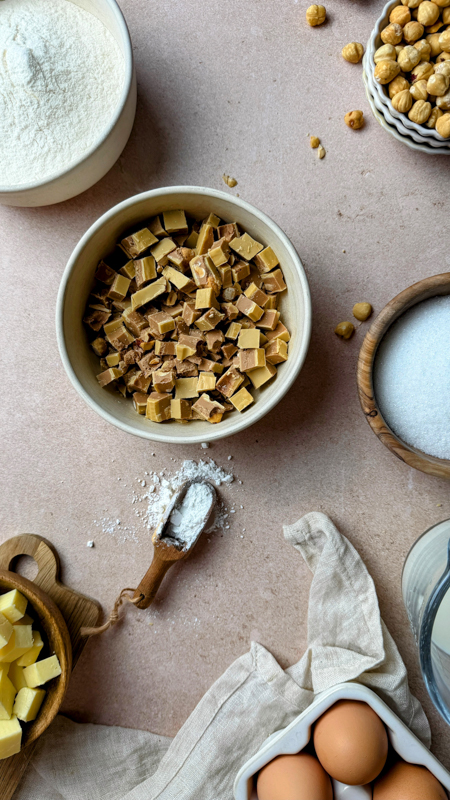 Ragusa Blond in kleine Würfel schneiden. In den Kühlschrank legen (damit das Ragusa beim Backen der Muffins nicht zu schnell schmilzt).
